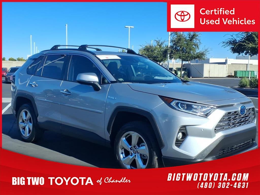 The 2021 Toyota RAV4 Hybrid Limited is a certified pre-owned vehicle that offers a powerful yet efficient all wheel drive system. With only 13,182 miles on the clock, this car is practically brand new and comes with a 2.5 liter Hybrid I4 219hp direct injection engine, all wheel drive, and a crash test rating of 5 out of 5 stars. It also features a number of advanced features such as touch screen display, Bluetooth audio connection, blind spot sensor, hill start assist, on demand four wheel drive, Apple Carplay ready, navigation system with voice recognition, and more. Whether you're looking for a reliable commuter or an off-road adventure car, this car has it all! Contact Details: Big Two Toyota, 1250 S. Gilbert Road, Chandler, AZ, 85286, sales@bigtwo.com, 4808986000.