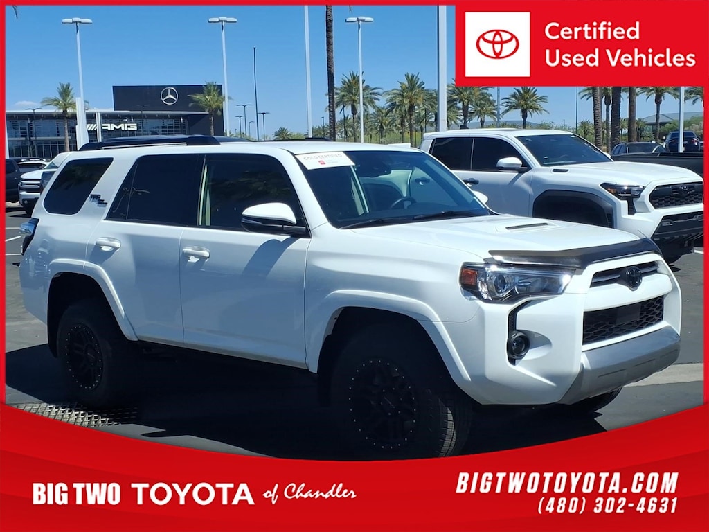 The 2023 Toyota 4Runner TRD Off-Road Premium is a certified pre-owned vehicle with 83,714 miles. It features a 4.0 liter 6 cylinder engine with sequential port fuel injection, and has a crash test rating of 4 out of 5 stars. This SUV 4x4 also comes equipped with blind spot sensor, hill start assist, part time four wheel drive, navigation system with voice recognition, and a touch screen display. With its advanced technology and safety features, this car is sure to provide an enjoyable driving experience for years to come. Contact Details: Big Two Toyota, 1250 S. Gilbert Road, Chandler, AZ, 85286, sales@bigtwo.com, 4808986000.