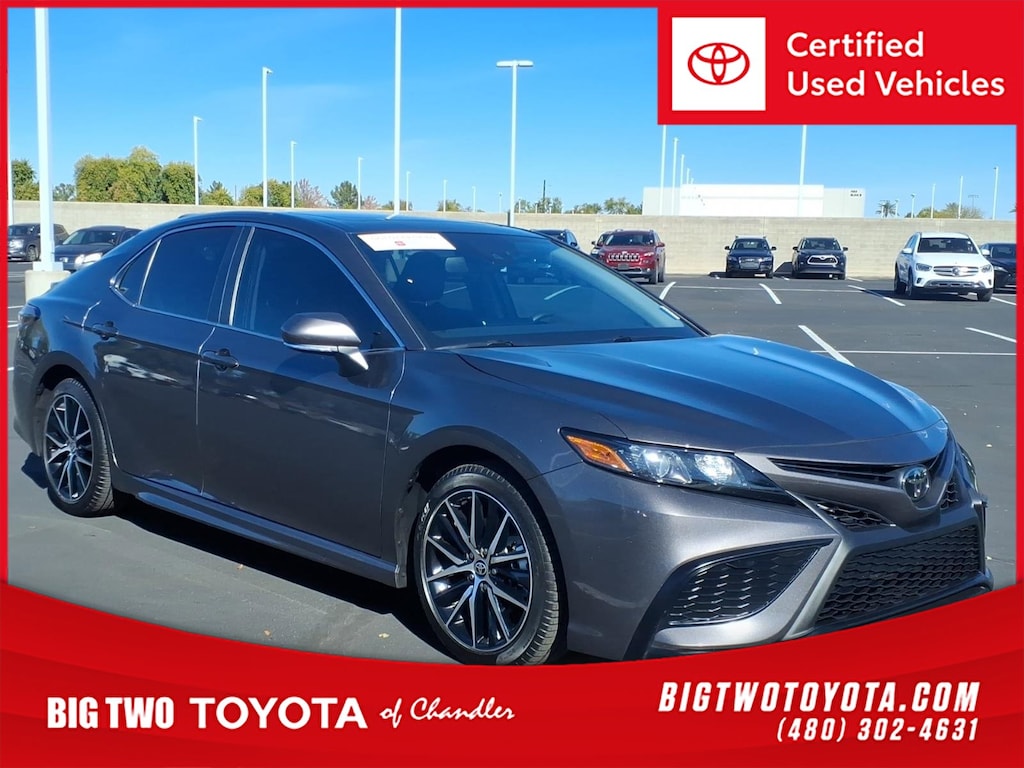 This vehicle is a 2023 Toyota Camry SE, certified pre-owned and with 30,036 miles. It has a 2.5 liter 4 cylinder engine with fuel injection and a front wheel drive system, making it an ideal choice for those looking for a reliable car. It has an impressive crash test rating of 5 out of 5 stars, and its fuel economy in city is 28 mpg and on highway 39 mpg. It also comes with a number of features such as touch screen display, Bluetooth audio connection, blind spot sensor, hill start assist, Apple Carplay ready, and Bluetooth phone connectivity. This car truly has it all! Contact Details: Big Two Toyota, 1250 S. Gilbert Road, Chandler, AZ, 85286, sales@bigtwo.com, 4808986000.