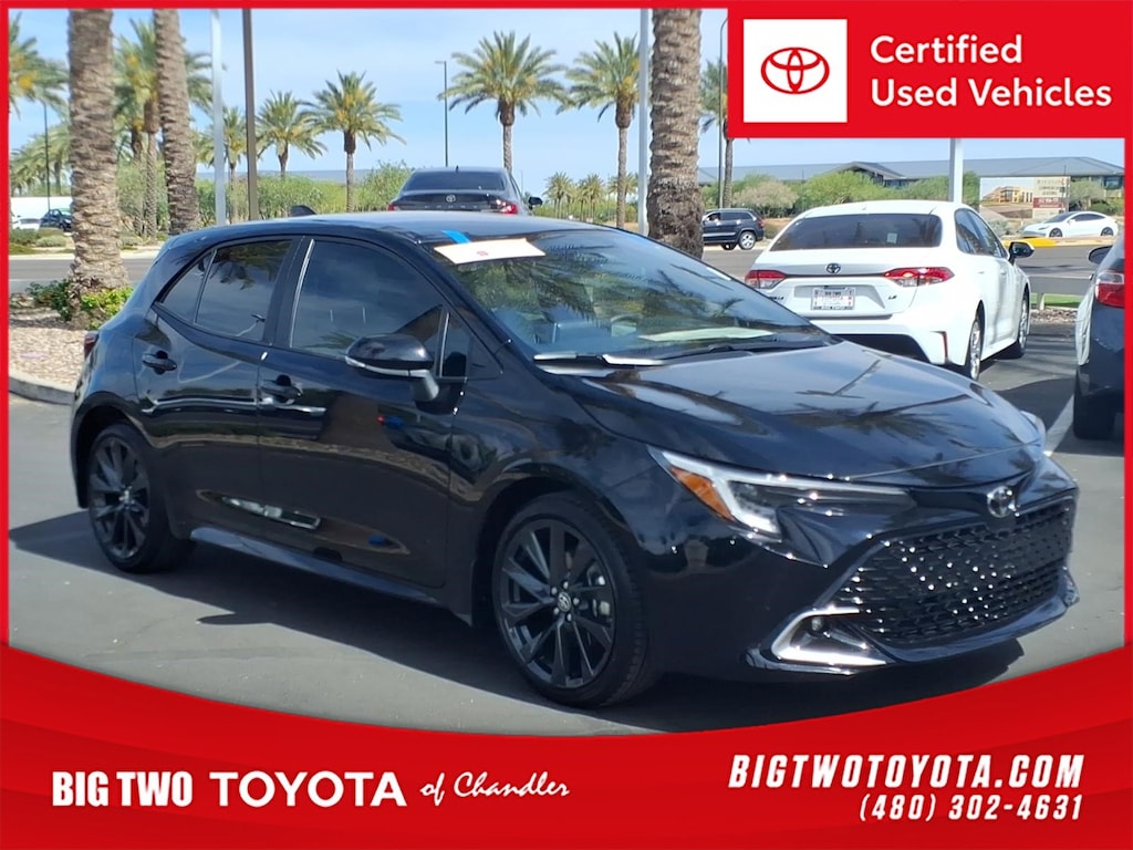 The 2025 Toyota Corolla Hatchback XSE is a certified pre-owned vehicle with only 17,003 miles on it. It features a 2.0 liter I4 169hp 151 lb-ft engine with direct injection, and has an impressive fuel economy of 30 mpg in the city and 38 mpg on the highway. This car also comes with a 5 out of 5 star crash test rating, as well as a variety of modern features such as a touch screen display, Bluetooth audio connection, blind spot sensor, hill start assist, and Bluetooth phone connectivity. The interior of the car is made with leather seats for added comfort and style. With its low mileage and advanced technology, the 2025 Toyota Corolla Hatchback XSE is sure to be a great choice for any driver. Contact Details: Big Two Toyota, 1250 S. Gilbert Road, Chandler, AZ, 85286, sales@bigtwo.com, 4808986000.